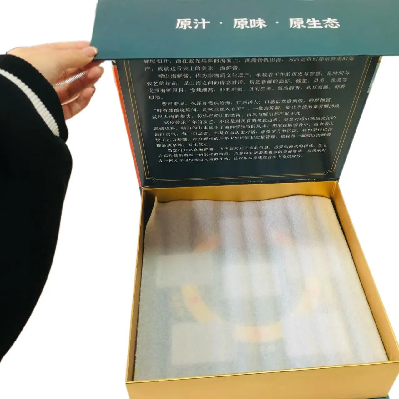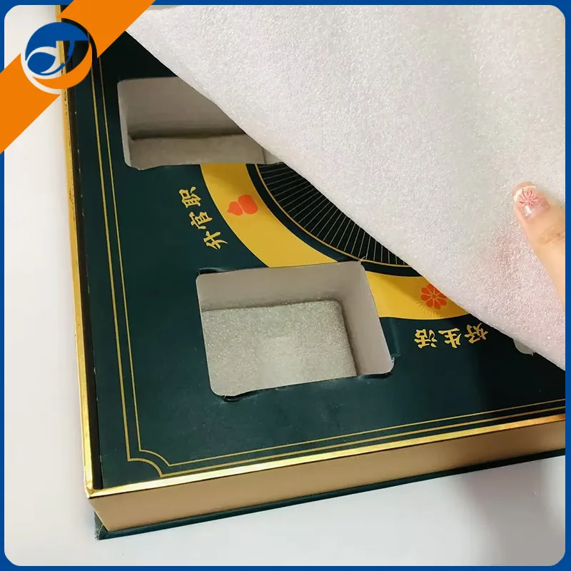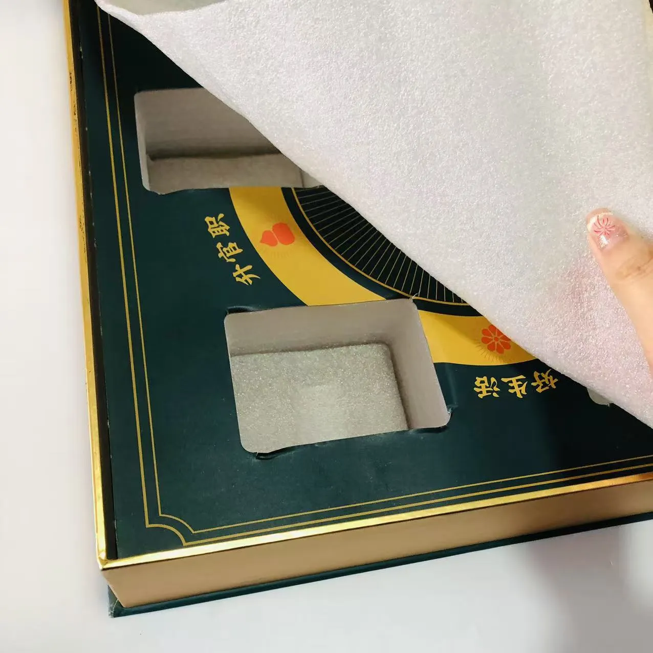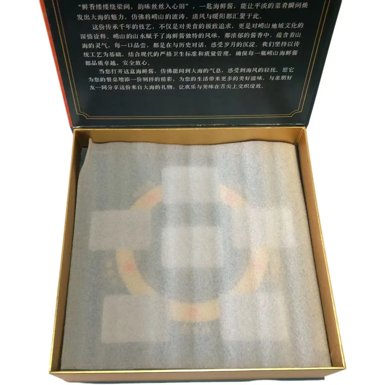Hediye kutusunun içinde, kutunun içini kaplarken şok emilimi ve tamponlama etkileri sağlayabilen özelleştirilmiş bir sünger astar bulunmaktadır. Kutunun içinde altı bölme vardır ve bölmeler şişe gövdesine mükemmel şekilde yerleştirilmiştir.